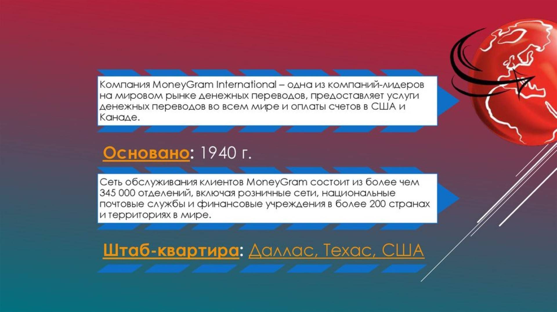 Организация «MoneyGram» — система мгновенного перевода денег, созданная в 1940 году в Америке. Уникальная процедура разрабатывалась годами, потому масштаб функционирования уже долгое время держится на мировом уровне. Организация абсолютно надежна и доступна для граждан любых стран.
