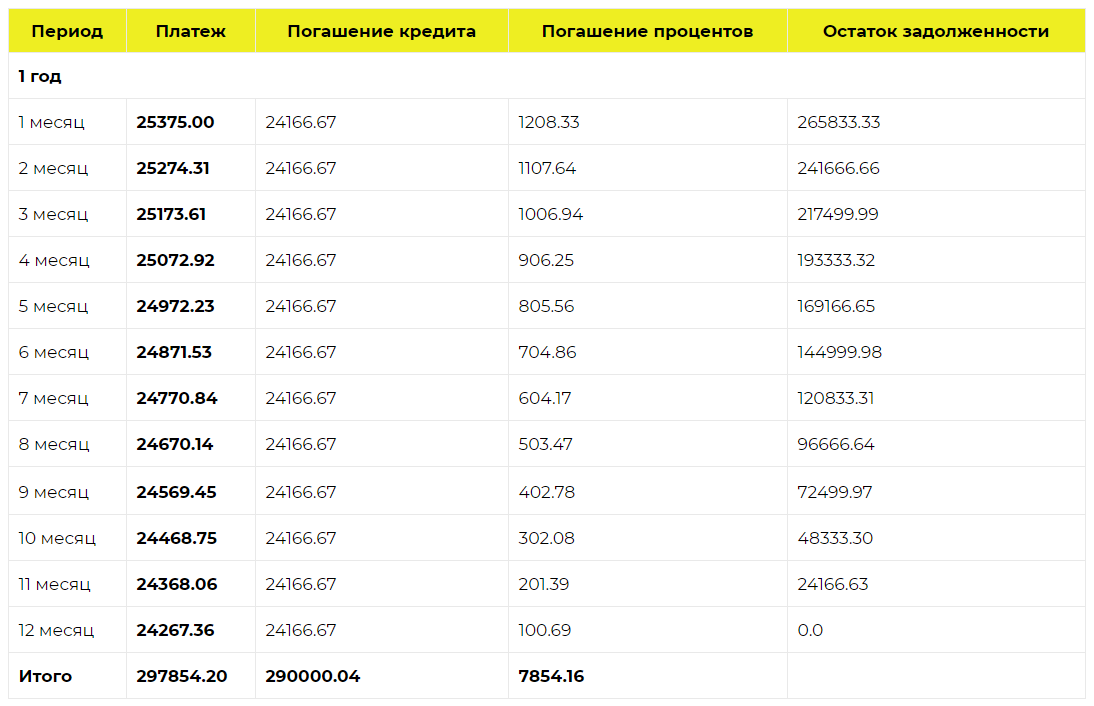 Дифференцированный платеж — это способ погашения займа, при котором тело кредита остается неизменным на протяжении всего срока выплаты, а плата по процентам уменьшаются. В начале срока выплат заемщик платит по процентам максимальную сумму. Однако каждый последующий месяц эта сумма уменьшается. Следовательно, уменьшается и сам платеж по кредиту. Наглядно это демонстрирует таблица ниже.