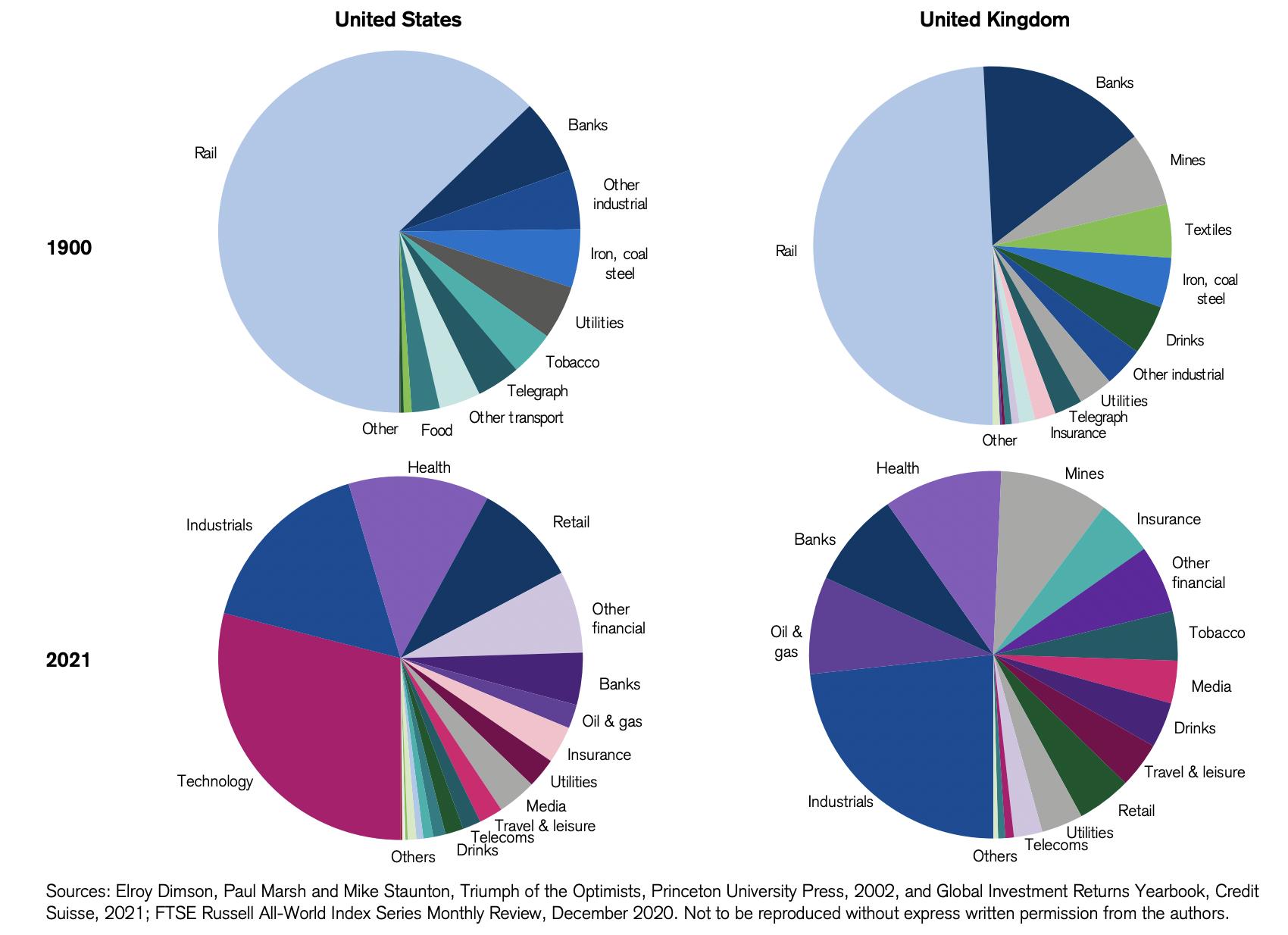 Сейчас существенную долю мирового распределения занимает IT-сектор, но это не значит, что он всегда будет оставаться доминирующим. Если бы в 1900 году вы вложили все ваши средства в ж/д транспорт США (самая перспективная индустрия на тот момент), то к 2021 году потеряли бы значительную часть сбережений.