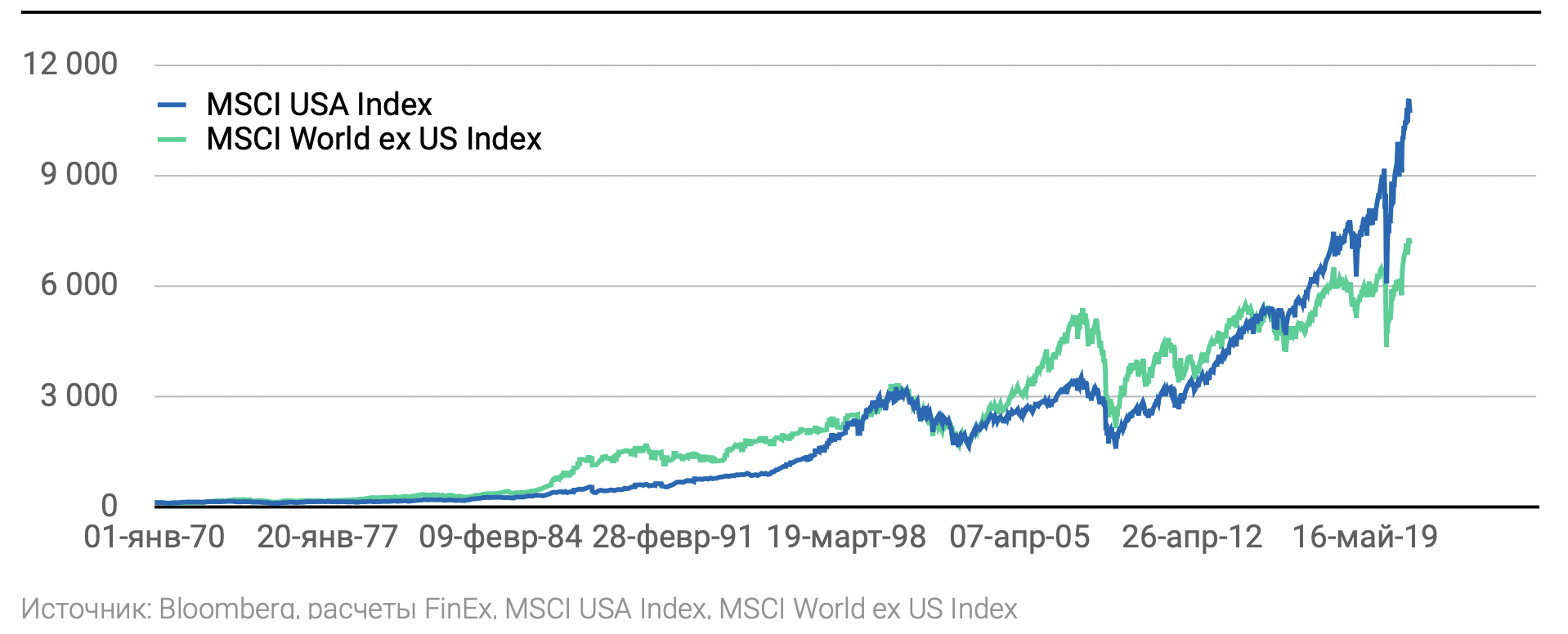 Динамика индексов MSCI USA Index, MSCI World ex US Index, 1970–2021 годы