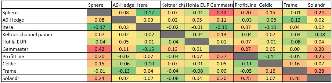 СКО уменьшилось в три раза до 0.5%, просадка — в 4 раза до -6%, а соотношение доходности и просадки достигло 3.29, то есть больше в 3.5 раза! Показатели рисков ПАММ-счетов из списка не так уж сильно отличаются от акций, но диверсификация сработала в разы лучше. Этого удалось достичь в первую очередь потому, что я отобрал ПАММы без сильных корреляций между собой: