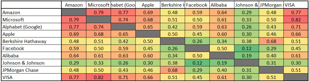 Для начала, надо быть Вангой, чтобы использовать такую удачную инвестиционную стратегию. И всё же это правда, что выигрыш не очень большой, потому что если смотреть по показателю доходность/просадка — он вырос всего на 0.06. И это когда 3 компании из 10 достигли значения 1 и выше. Дело в том, что составленный нами портфель не очень хорош с точки зрения диверсификации вложений — некоторые акции сильно связаны между собой, например те же Microsoft и VISA:
