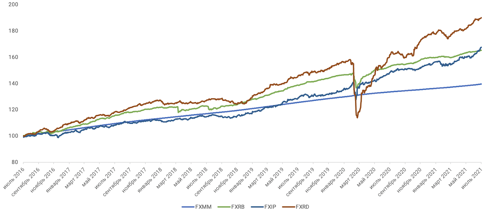 Примечание: используемые данные по FXRB — NAV, для расчета захеджированных индексов Solactive 1-3 month US T-Bill Index (FXMM), Solactive US 5-20 Year Treasury Inflation-Linked Bond Index (FXIP) и Solactive USD Fallen Angel Issuer Capped Index (FXRD) использовались дневные исторические ценовые данные индексов (в долларах), которые корректировались на соответствующие одномесячные форвардные рублевые ставки (за вычетом безрисковой долларовой ставки); период расчета — 30.07.2015-30.07.2021