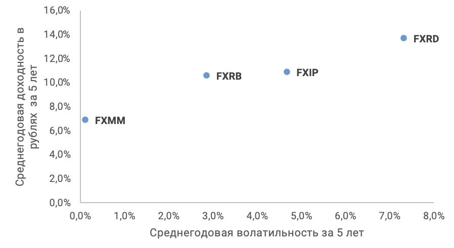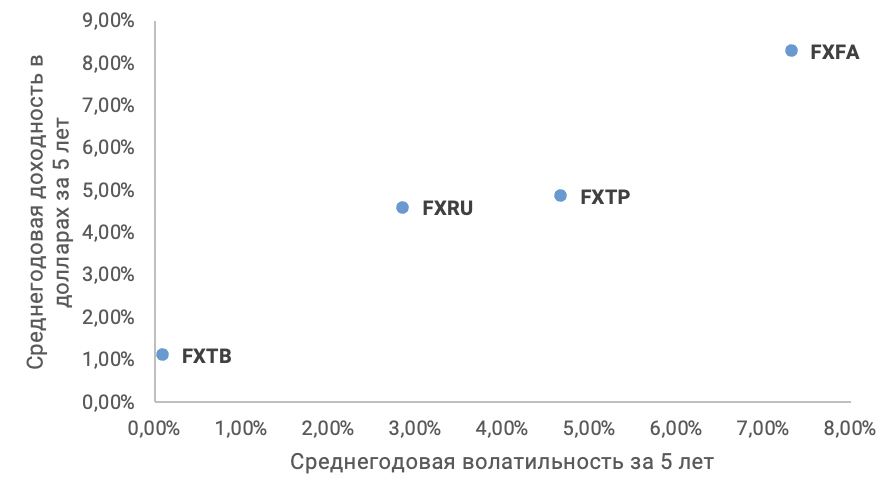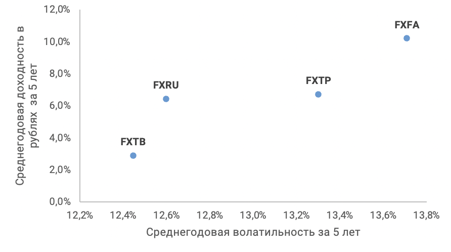 Рисунок 6. Доходность и волатильность ETF облигаций с валютным хеджированием за последние 5 лет (RUB)