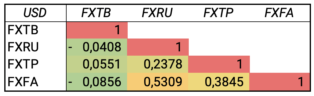 При выборе инструментов и принятии решений инвесторы также ориентируются на корреляцию между активами в их портфеле. Так, корреляция (USD) между выбранными ETF не слишком высокая, а значит их можно эффективно комбинировать в индивидуальном портфеле. Корреляция тех же самых ETF в рублях весьма высокая за счет влияния курса рубля. С помощью добавления хеджированных фондов FXMM, FXRB и FXIP можно добиться улучшенной диверсификации, так как корреляция с данными ETF очень низкая. Результаты анализа можно увидеть на рисунках 7 и 8 ниже.