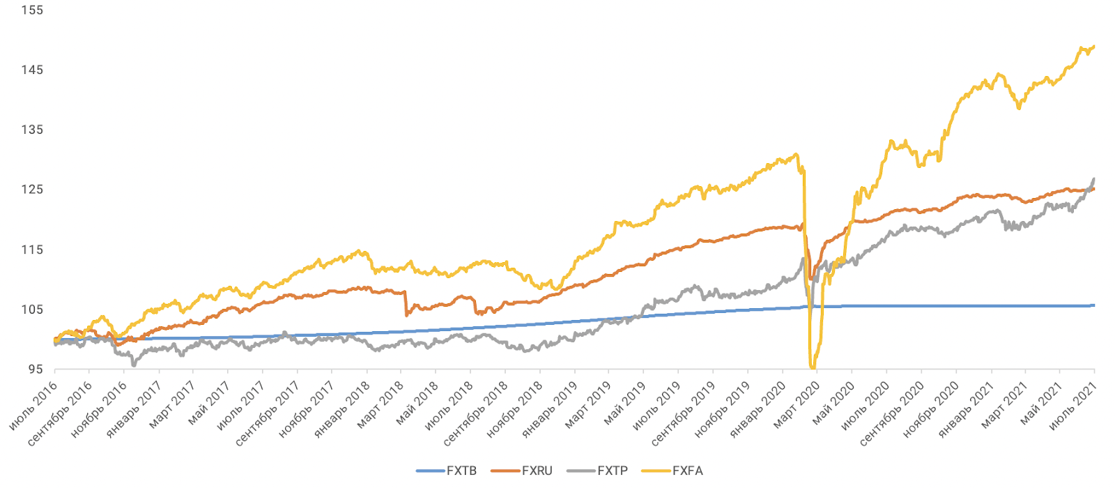 Примечание: FXTB = Solactive 1-3 month US T-Bill Index, FXRU = Bloomberg Barclays Tradable Russian Corporate Bond (EMRUS) Index, FXTP = Solactive US 5-20 Year Treasury Inflation-Linked Bond Index, FXFA = Solactive USD Fallen Angel Issuer Capped Index; период расчета — 30.07.2015-30.07.2021