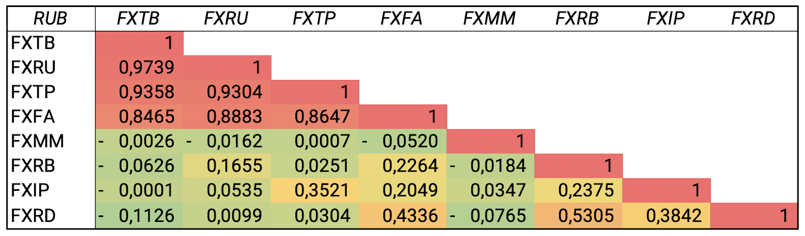 Рисунок 8. Корреляция ETF облигаций за последние 5 лет (RUB)