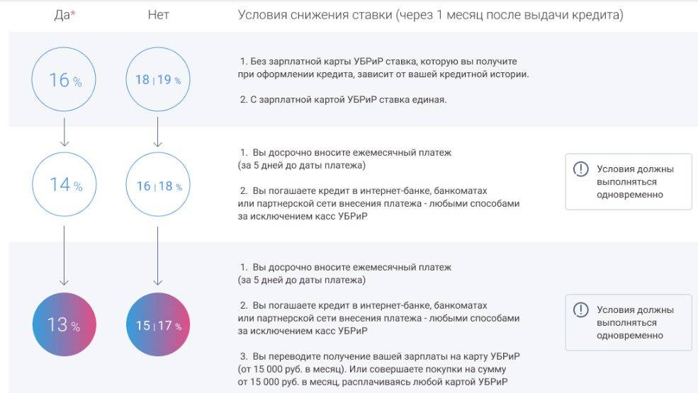- до 13,9 – 15% годовых (до 13% зарплатным клиентам) при соблюдении предыдущих условий и переводе получения заработной платы на счет в УБРиР или совершение покупок картой УБРиР на сумму не меньше 15 тыс. рублей в месяц.