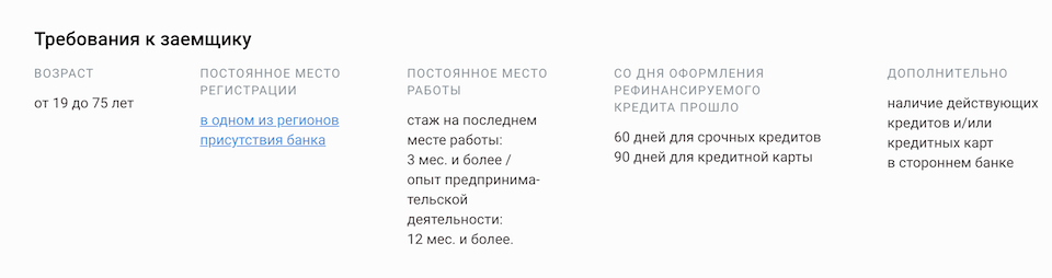 Прочие условия: необходимым пунктом для проведения процедуры рефинансирования являются сроки с момента появления кредитных обязательств: более 2 месяцев с заключения договоров срочного кредитования и более 3 месяцев с оформления кредитных карт в других банках.