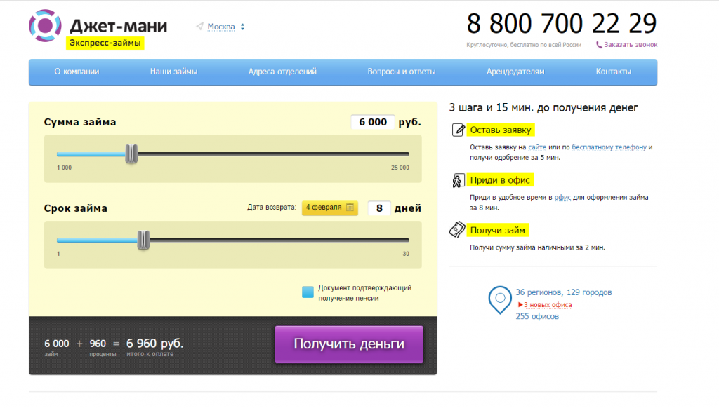 В течение пяти минут после отправки анкеты она будет рассмотрена. На указанный в анкете номер мобильного телефона позвонит кредитный менеджер и сообщит о решении кредитора. Если оно положительное, будет сделано приглашение в один из офисов для получения наличных.