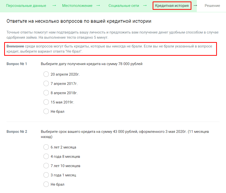 МФО Екапуста, с помощью 5 вопросов проверит вашу кредитную историю. Отвечайте так, «как есть». Вопросы задаются ради проверки вашей честности.