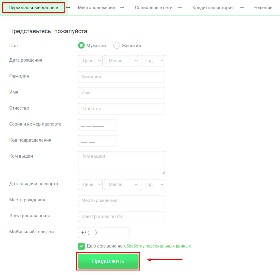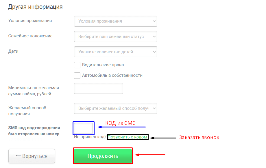 Условия проживания Своё семейное положение Если есть дети, укажите количество Водительские права Автотранспорт находящийся в вашей собственности Минимальную сумму, которую бы вы хотели (важно! Желаемая сумма может не совпасть с одобренной) Как вы хотите получить деньги Нужно указать 4-х значный код подтверждения из смс который вам должен был прийти. Если этого не произошло, ниже можно заказать звонок робота, который продиктует вам четыре цифры. рис