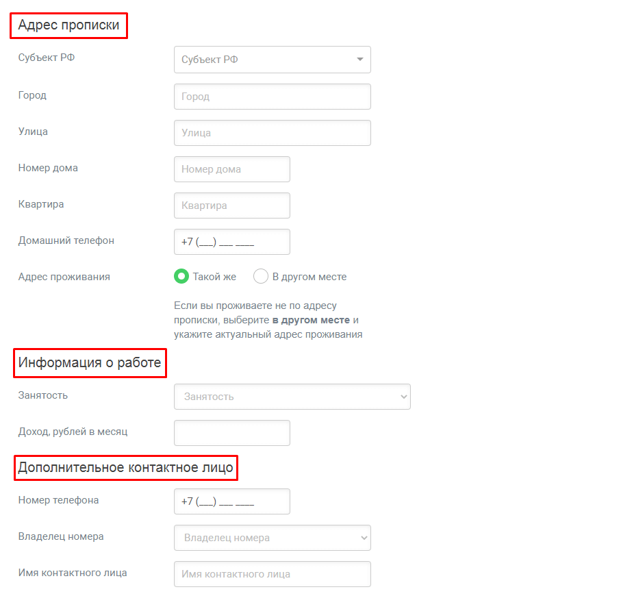 - Адрес проживания (если вы живёте не там где прописаны, то выбрать нужно пункт «В другом месте», и дополнительно прописать адрес где вы проживаете в данный момент)