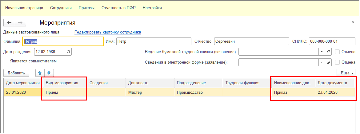- Информацию о работнике: ФИО, дата рождения, СНИЛС, должность.