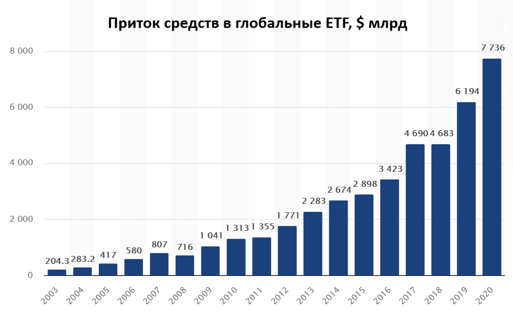 Важно отметить возрастающую популярность инвестирования в биржевые фонды, которая увеличивается из года в год