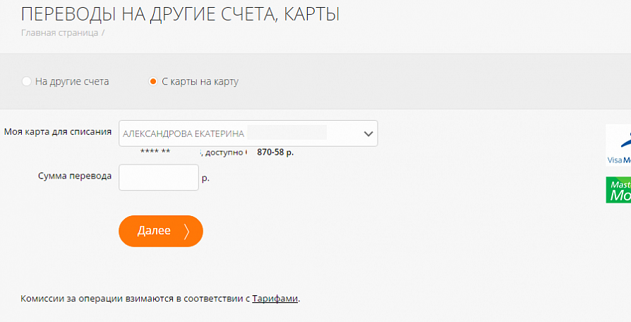 Если вы хотите положить деньги со своей карты Бинбанка, то совершить транзакцию без комиссии можно онлайн в интернет-банке, перейдя в раздел Переводы на другие счета, карты.
