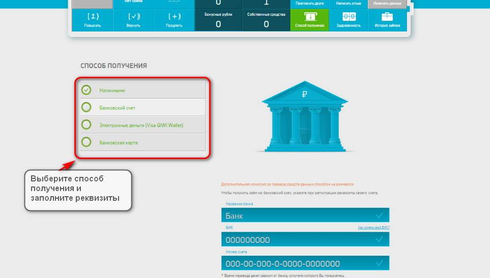 После открытия своего аккаунта требуется выбрать команду «Перевести», что подразумевает осуществление перевода на банковский счет, карту или другой кошелек. Клиент вправе самостоятельно распоряжаться выданным займом.