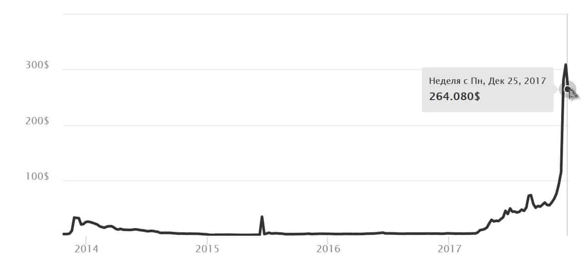 На сегодняшний момент стоимость одной монеты весьма скромная, а именно на начало 2018 года чуть больше 9000 рублей, по сравнению с тем что Bitcoin около 500000 рублей. Но это не говорит о том, что вкладывать инвестиции в лайткоин нецелесообразно. График курса Litecoin за все время выглядит так.