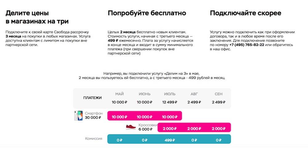 Если лимита на покупки вне партнерской сети нет — у «Свободы» есть опция «Делим на три». Она продляет рассрочку на 3 месяца. Причем за первые два месяца денег не берут. Правда, третий и последующие месяцы стоят уже по 499 рублей каждый.