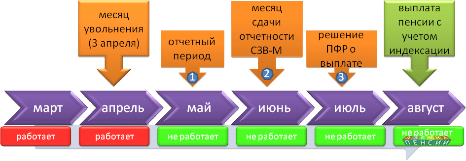 Как это работает? Скажем, если вы уволились в мае 2019 года, то в июне Пенсионный Фонд РФ получит от вашего работодателя отчет за май с информацией о том, что в том месяце вы еще считаетесь работающим. В июне вы уже таковым не будете числиться. ПФ вынесет соответствующее решение и прибавка к пенсии будет возобновлена. В июле вы получите выплаты в полном объеме, плюс будет прибавка (разница между бывшим и обновленным размером пенсии за три последних месяца). То есть человеку будет начисляться пенсионная выплата в полном объеме через те же самые 3 месяца после того, как он уволился, но этот период ему полностью компенсируют.