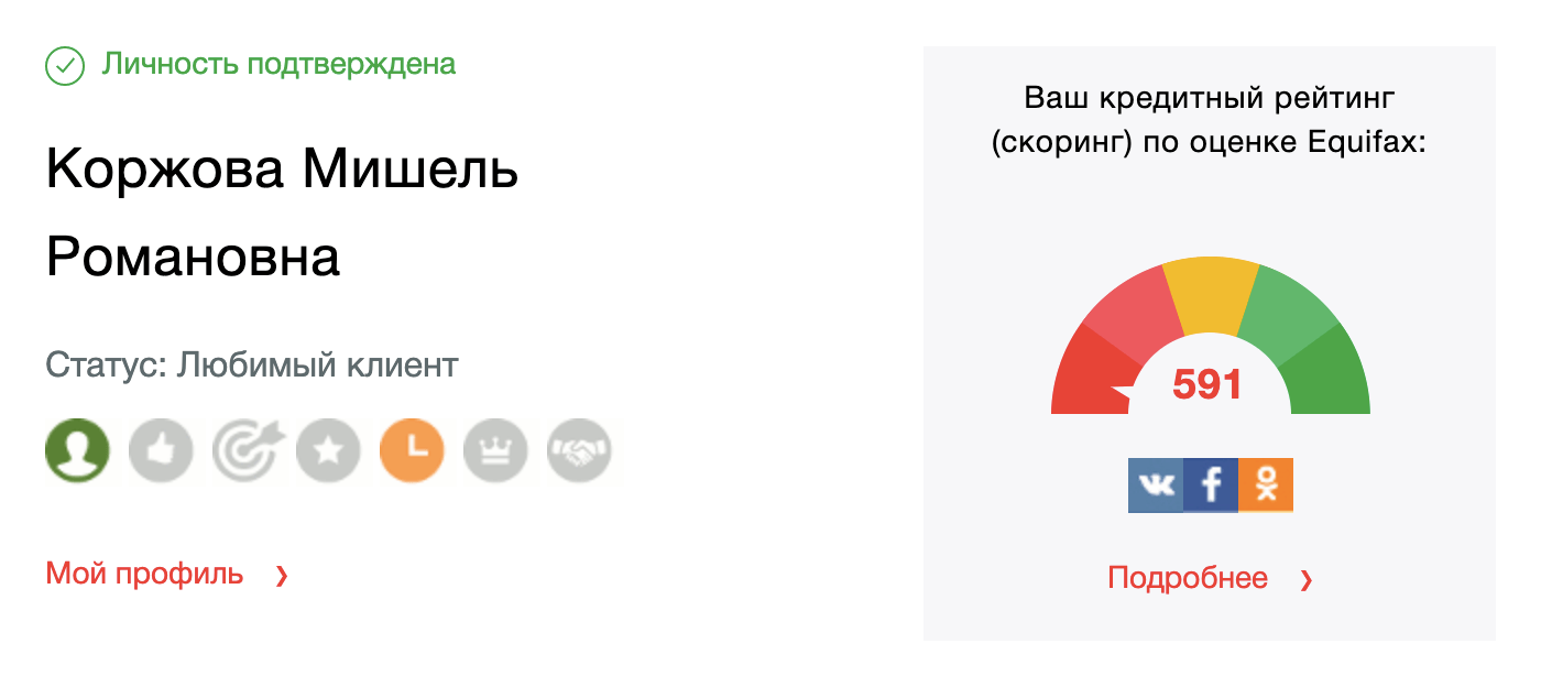 БКИ «Эквифакс» указывает кредитный рейтинг в личном кабинете у себя на сайте, а также его можно увидеть в кредитном отчете.