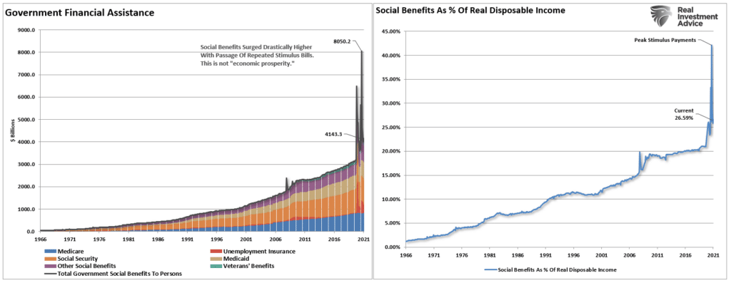 Самым прямым свидетельством снижения экономического благосостояния является показатель роста общественного благосостояния в процентах от располагаемых доходов. Финансирование недополученных налоговых отчислений — это игра с нулевой суммой, которая увеличивает дефляционное давление на экономику из-за долга, необходимого для ее финансирования.