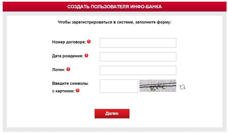 Чтобы получить доступ к интернет-сервису, необходимо открыть страницу входа в ИНФО-Банк. Для регистрации нужно указать номер кредитного договора, логин и дату рождения.
