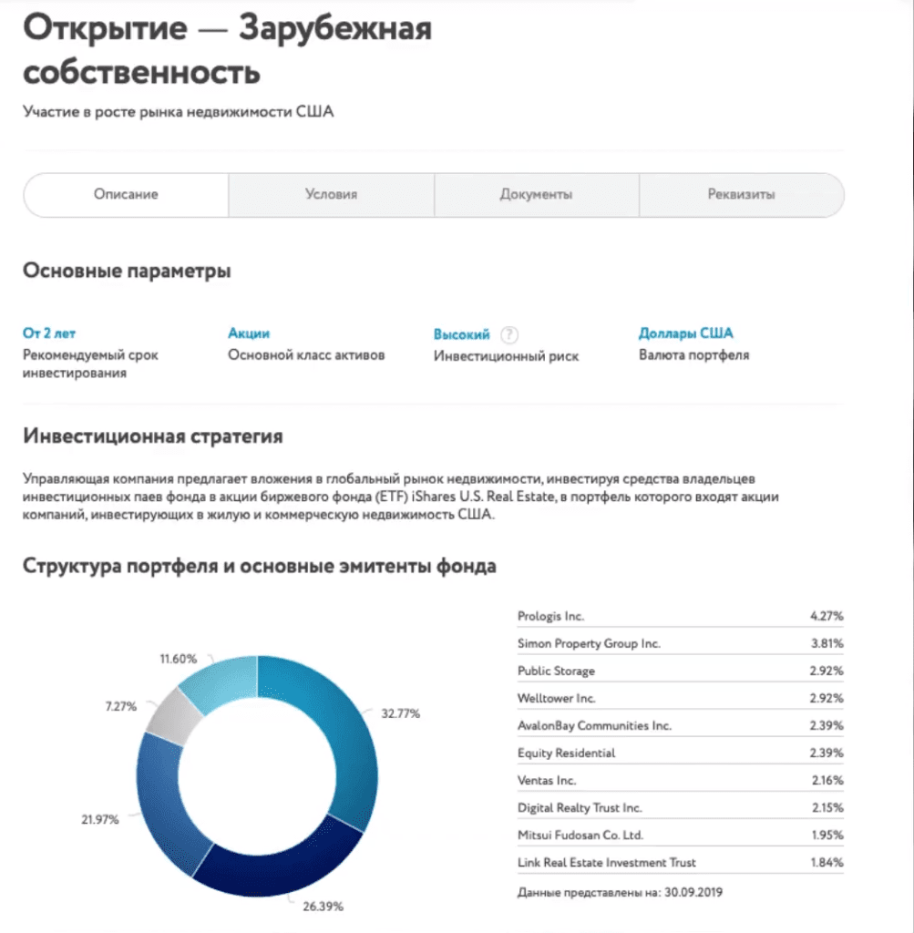 - ПИФЫ, которые инвестируют в ETF на REIT. Вот тут внимательнее, если есть непонятное слово – читайте отдельные статьи. На сегодня есть ПИФ «Открытие – Зарубежная собственность». Хороший вариант, если не хочется вручную анализировать и выбирать компании. Из минусов – вам накинут комиссию за управление.
