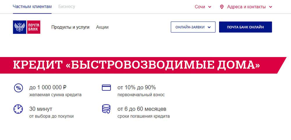 - Несмотря на отсутствие ипотечных программ, в «Почта Банке» можно оформить подходящий кредит — максимум на 4 млн руб. и на срок до 5 лет.