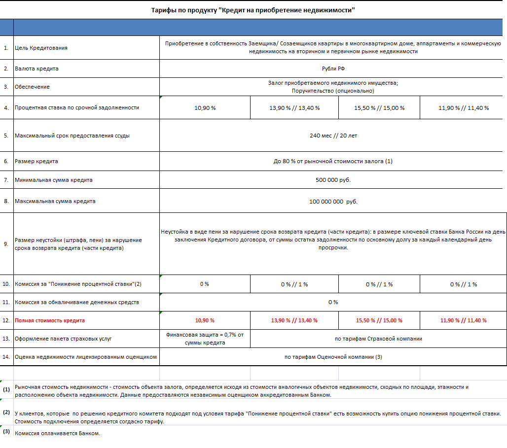 Возраст клиента для получения ипотечного кредита: от 20 до 85 лет. Верхняя граница должна быть достигнута не ранее, чем завершится действие кредитного договора. Потенциальный заёмщик должен иметь постоянную регистрацию в любом регионе России. Процентная ставка составляет от 10,9% до 15,5%, зависит от платежеспособности клиента, размера первоначального взноса и пакета предоставляемых документов. Клиент может досрочно погасить задолженность на любом сроке кредитования с перерасчётом процентов. На первом этапе оформления ипотеки на приобретение недвижимости заёмщику необходимо предоставить следующий пакет документов: