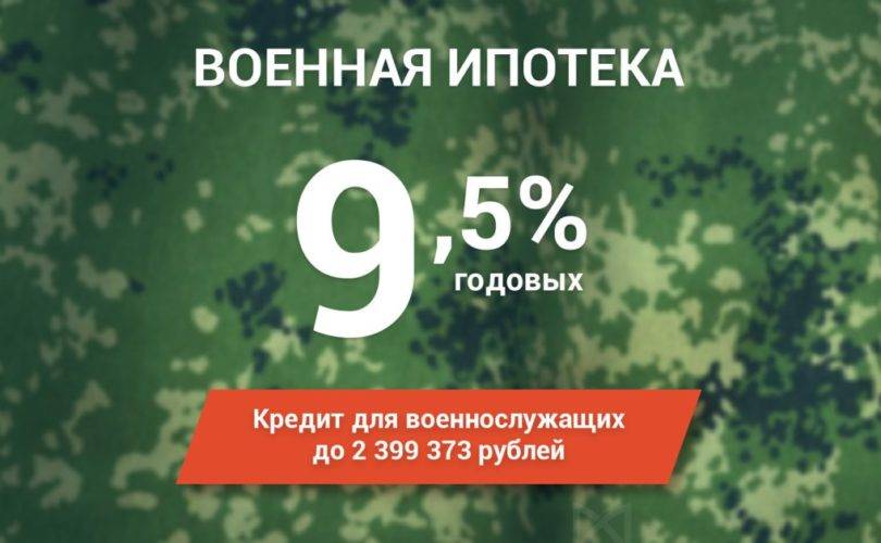 | Кредит | Господдержка 2020 — от 5.5%Ипотека с господдержкой для семей с детьми — от 6%Военная ипотека (вторичный рынок) — от 7.5%Военная ипотека (первичный рынок) — от 7.5%Новостройка — от 7.8%На вторичное жилье — от 8.8%Рефинансирование ипотеки — от 9.8% |