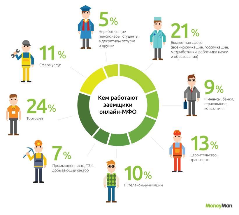 Что касается рода занятий заемщиков, то 24% из них являются работниками торговли, 21% – бюджетники, военные и госслужащие, 13% – водители, строители и разнорабочие, 11% трудятся в сфере услуг. Примечательно, что для онлайн-МФК характерна большая доля сотрудников финансового и ИТ-секторов экономики в сравнении с традиционными микрофинансовыми организациями.