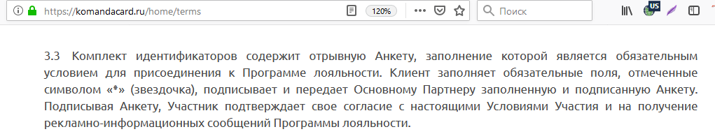 Получить информацию о начисленных бонусах на Вашей карте можно простым и удобным способом – онлайн через сеть Интернет. Для этого карта регистрируется на сайте https://komandacard.ru/ путем заполнения стандартной формы — вводится номер, телефон и пароль, а после этого нажимается кнопка регистрации (фото 1). Чтобы в будущем зайти в свой личный кабинет Вам потребуется указать лишь номер телефона и пароль.
