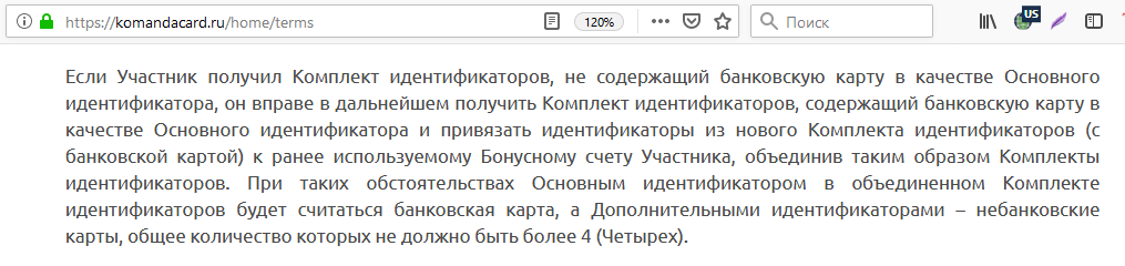 Все три карты объединены общим бонусным счетом. Но у активных участников программы лояльности есть возможность увеличить количество дополнительных карт до 4-х штук. Для этого следует вначале оформить комплект карт во главе с небанковской бонусной картой, а после получить комплект карт, где основной картой будет банковская версия «Семейной команды». После этого останется лишь привязать новые карты к уже имеющемуся бонусному счету. В этом случае, основной картой будет считаться банковская и плюс к ней 4 дополнительных пластика.
