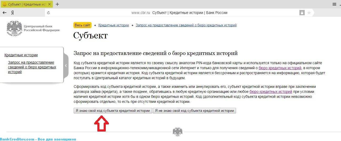 Здесь предлагаются еще два варианта. Если вы знаете необходимый код кредитной истории, жмете верхнюю кнопку. Если не знаете— жмете на нижнюю и читаете инструкцию, что делать в данном случае.