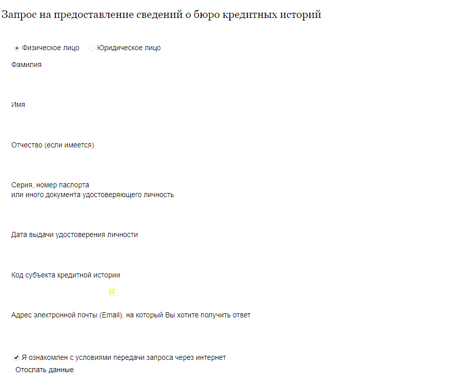 - Заполняем поля “Фамилия”, “Имя”, “Отчество (если имеется)”, “Серия, номер паспорта или иного документа удостоверяющего личность” (без пробелов), “Дата выдачи удостоверения личности”, “Код субъекта кредитной истории” (о нем расскажу ниже) и “Адрес электронной почты (Email), на который Вы хотите получить ответ”. После заполнения всех полей нажимаем кнопку “Отослать данные”. Скриншот: www.cbr.ru