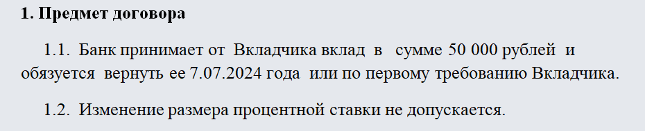 Информация о предмете указывается в начальных пунктах документа. В данном случае предметов сделки является денежная сумма, составляющая сам вклад. Выглядит такой пункт следующим образом: