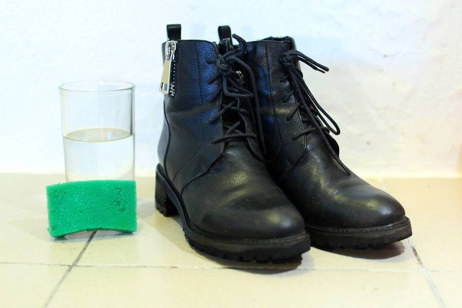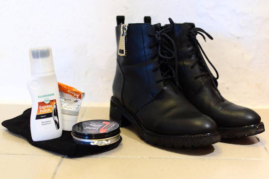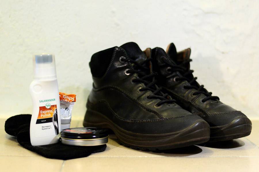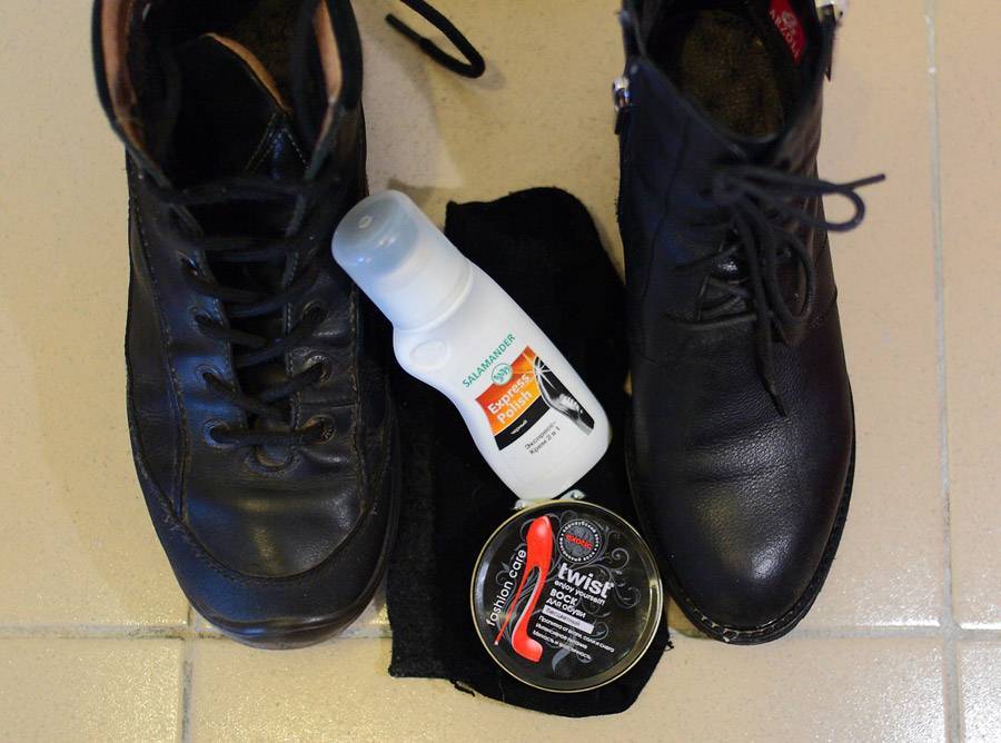 Ботинки, начищенные воском, черным кремом для кожи и составом для нубука