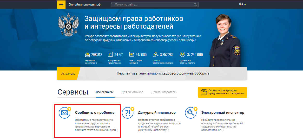 Сайт Онлайн Инспекция — это большой справочник по трудовым вопросам. С его помощью граждане знакомятся с действующими нормами, судебной практикой, консультируются со специалистами и направляют жалобы. Для отправки жалобы необходимо:
