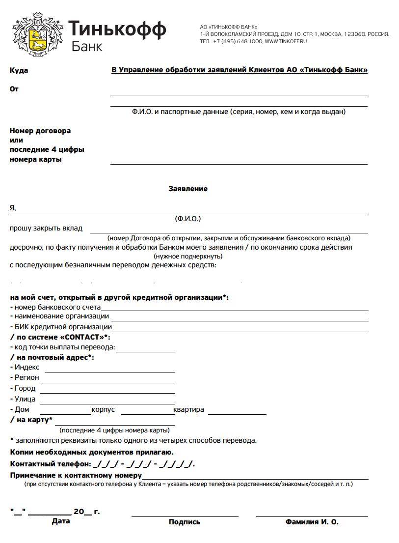 - Скачиваете и распечатываете образец заявления (по дебетовой карте – https://static.tcsbank.ru/documents/ib/document-list/statement_at_the_closing_of_deposit.pdf);