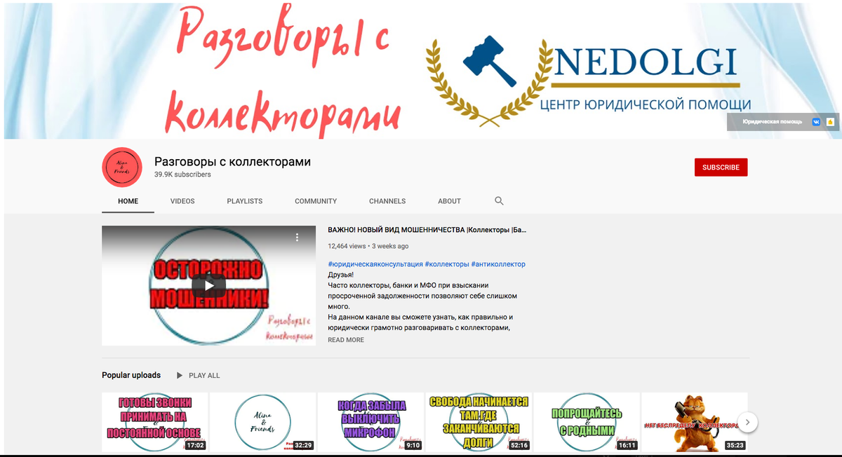 Некая Алина Александровна ведет канал на Youtube, под названием Разговоры с коллекторами. Количество подписчиков больше 39 тыс. Просмотров видео суммарно свыше 24 млн. Это самый популярный канал в данной тематике.