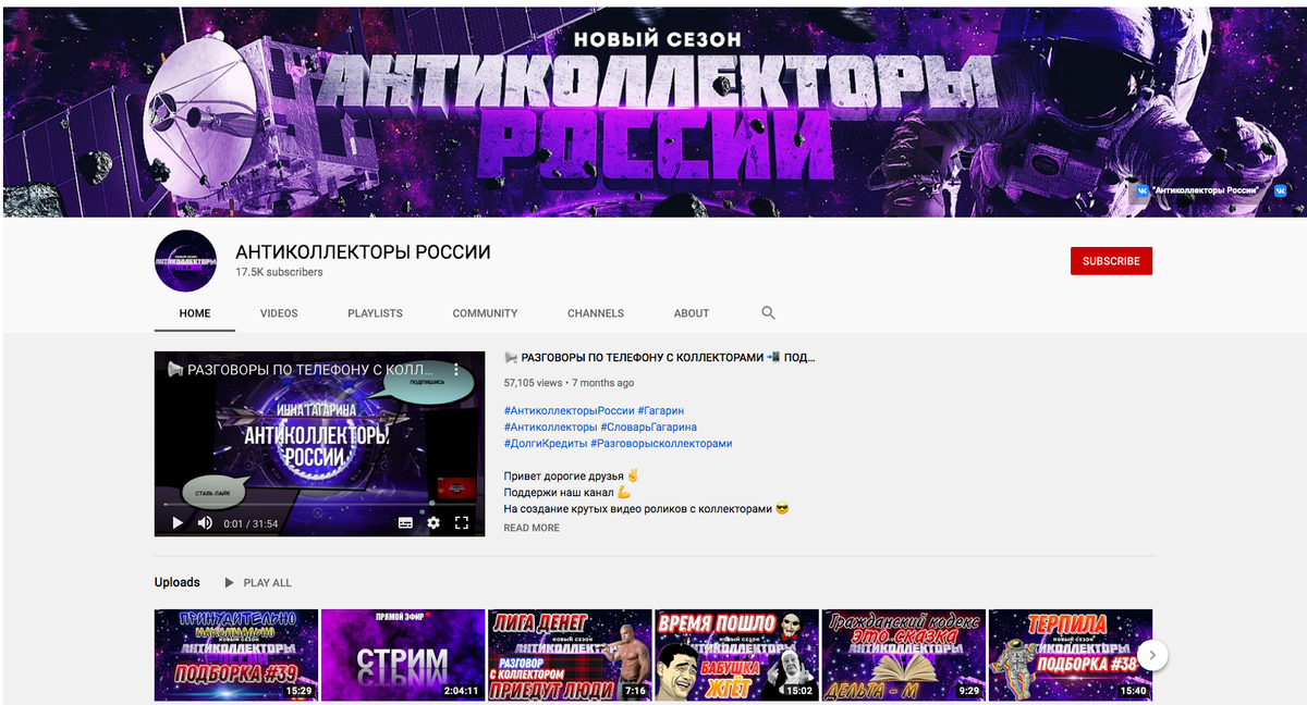 https://www.youtube.com/c/АНТИКОЛЛЕКТОРЫРОССИИ/featured — подписчиков более 17 тыс. — просмотров видео свыше 9 млн.