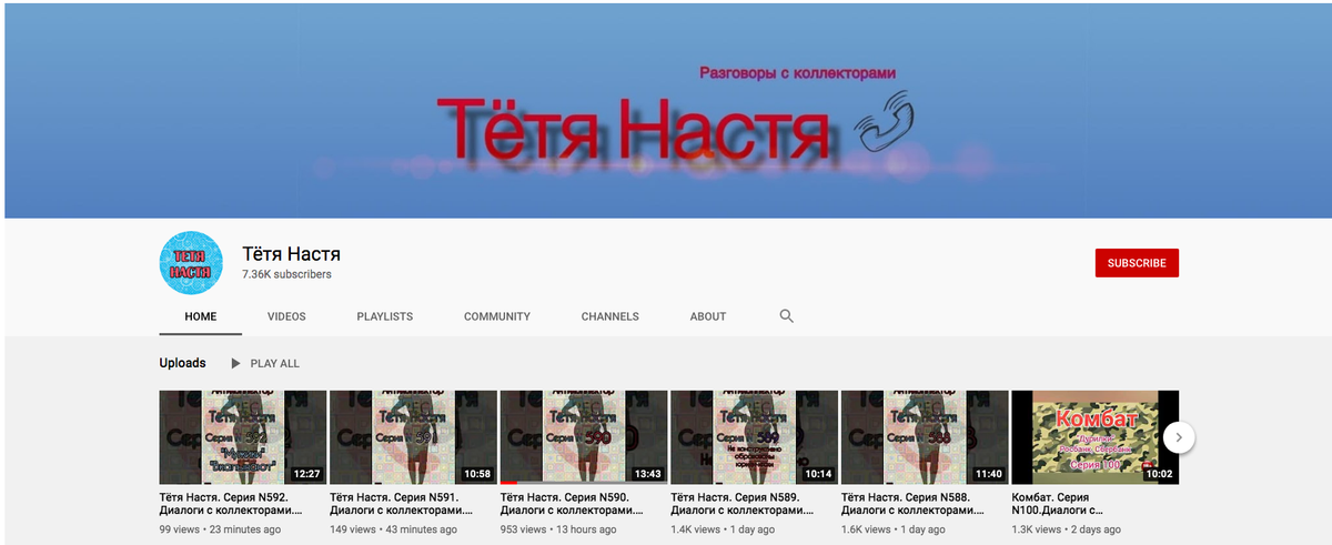 Канал антиколлектора Тётя Настя — https://www.youtube.com/channel/UCt9X1aRHe5c1x_GY0IPReRw — свыше 7 тыс. подписчиков — более 2,5 млн. просмотров видео.