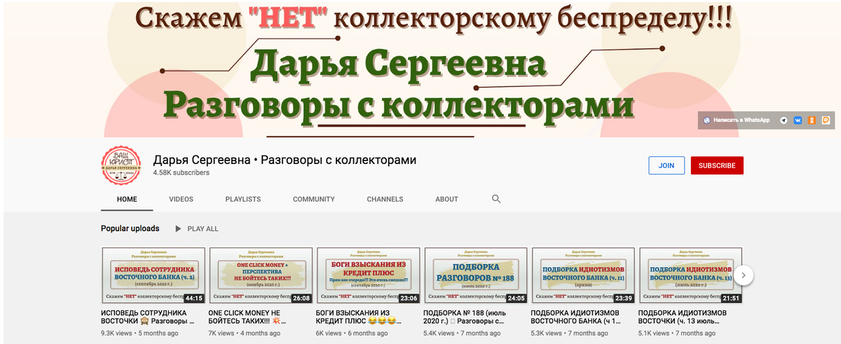 Канал Дарья Сергеевна Разговоры с коллекторами — https://www.youtube.com/channel/UCCyKqDVBUkpL-TlUyZMr9mg/featured — подписчиков более 4 тыс. — просмотров видео более 1 млн.