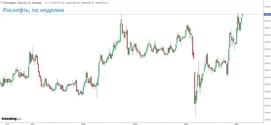 График динамики акций Роснефти с июля 2016 года по июнь 2021 года