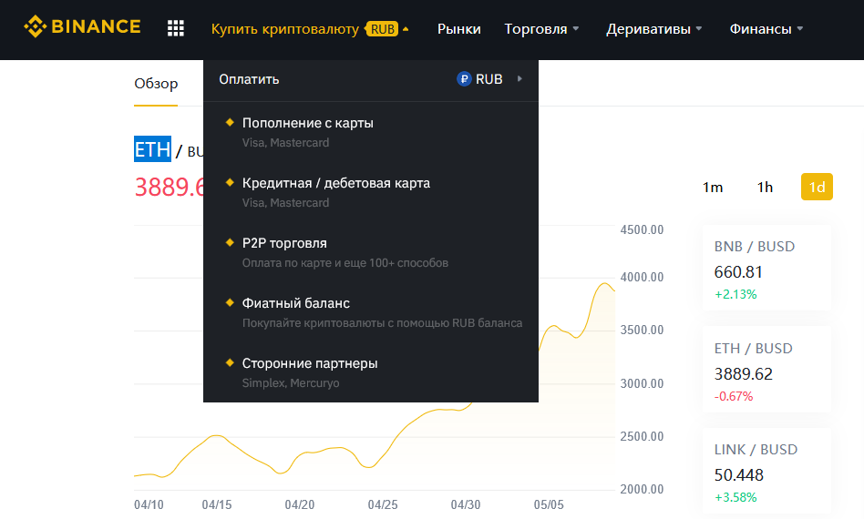 В 2020 году Binance ввел в действие P2P-сервис, дающий возможность покупать и продавать эфириум между участниками биржи. Цену и лимиты продавец выбирает сам. Продажа производится с помощью эскроу-сервиса(автоматического зачисления денег на отдельный счет до подтверждения). Есть более ста вариантов оплаты, один из них – через Сбербанк Онлайн.