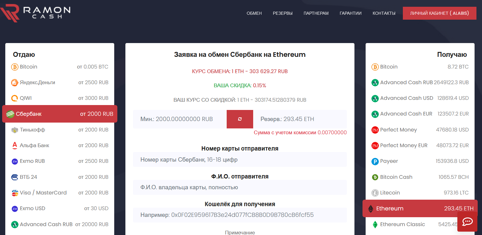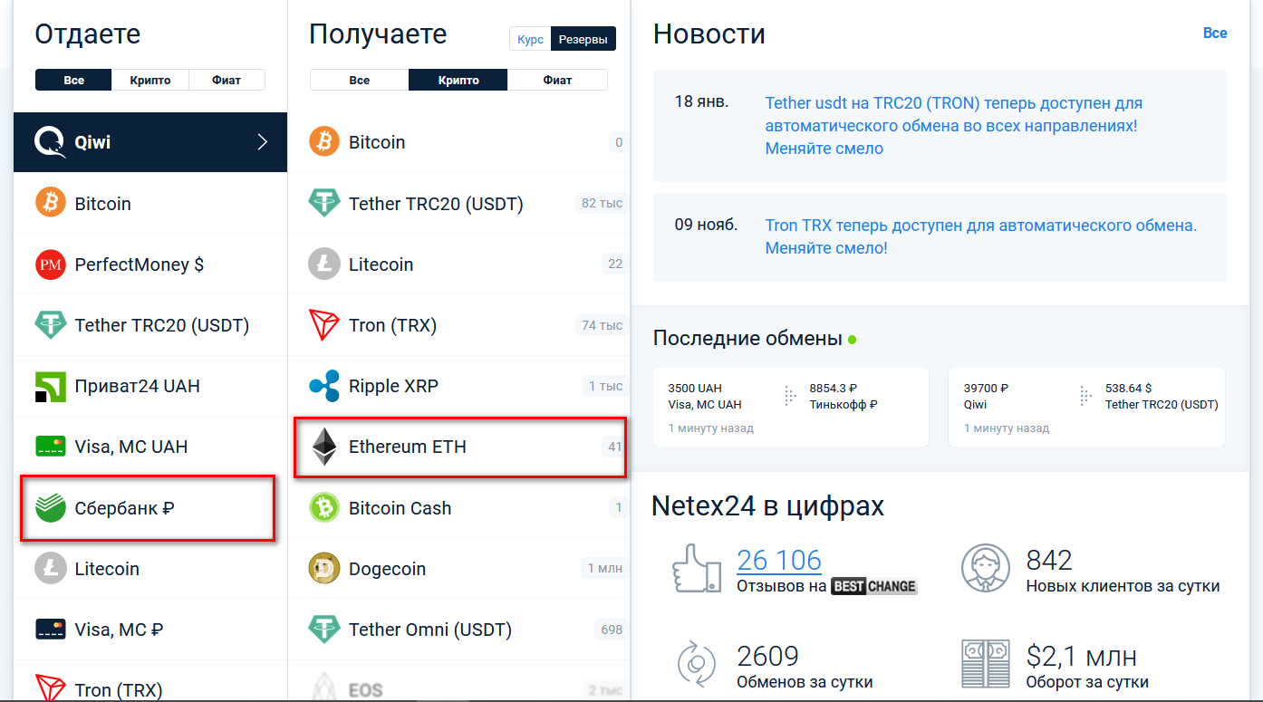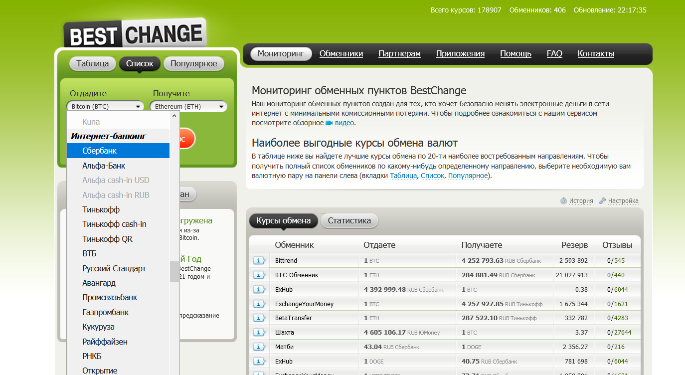 Опишем обмен на примере мультивалютного кошелька Exodus и мониторингового сервиса обмена BestChange. Переходите на сайт www.bestchange.ru и выбираете обменный пункт по направлению обмена Сбербанк – Ethereum.
