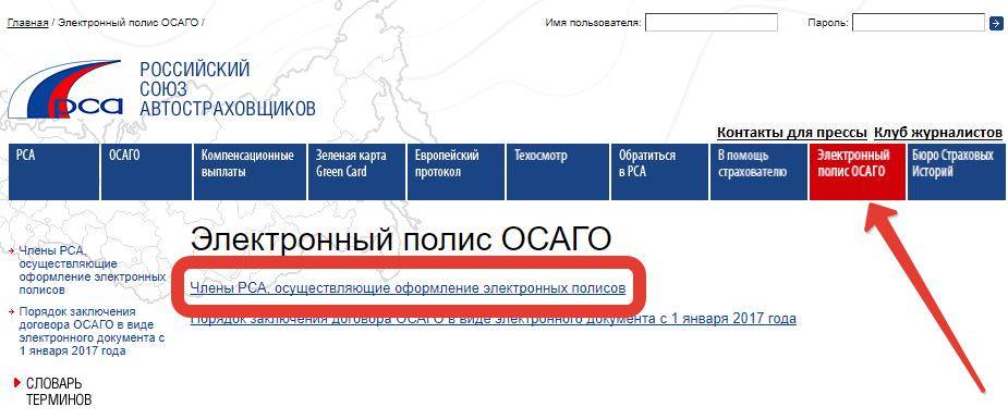 - Нажимаем на вкладку «электронный полис ОСАГО». Затем щелкаем на поле «члены РСА, осуществляющие оформление полисов».