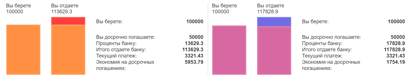 Сделаем досрочку через 1 год(слева) и через 2 года(справа) на 50 тыс. рублей и сравним переплату с помощью того же калькулятора сравнения кредитов.