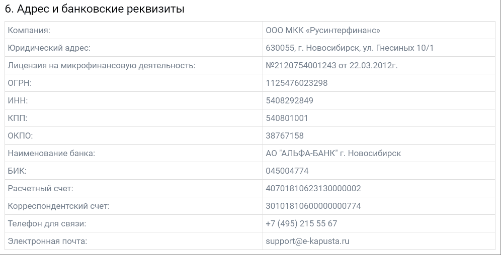 Счет компании обслуживается в «Альфа-банке». Официально предприятие зарегистрировано как ООО МКК «Русинтерфинанс».